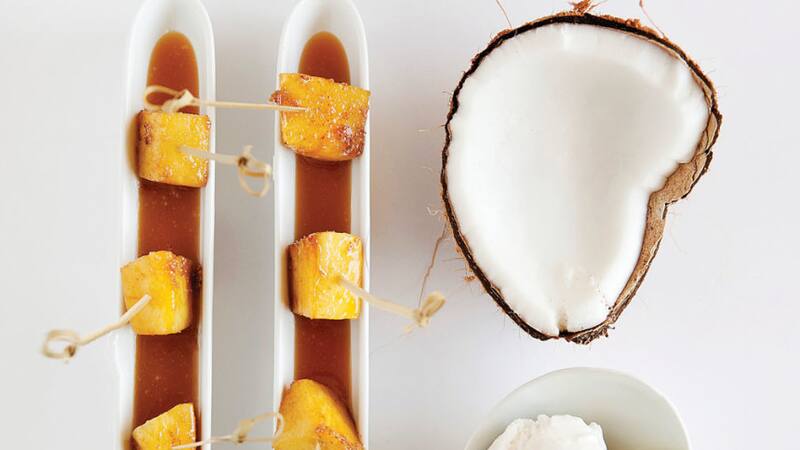 Brocheta de piña acaramelada, caramelo de coco y jengibre con helado de coco