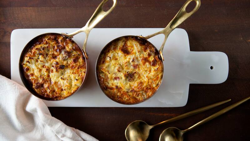 1. En un sartén sin aceite sofreír el tocino y agregar la cebolla. Si es necesario agregar un poco de aceite. Cuando la cebolla esté comenzando a dorarse, agregar los champiñones cortados en cuartos.