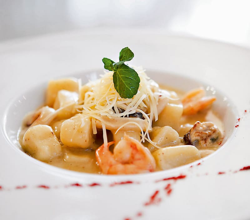 Ñoquis con salsa Frutti Di Mare: suaves, cremosos y hechos en el día ($ 2.600). Combinarlos con la sobrosa salsa frutti di mare, una reducción de crema con camarones, calamares y mejillones ($ 3.350).
