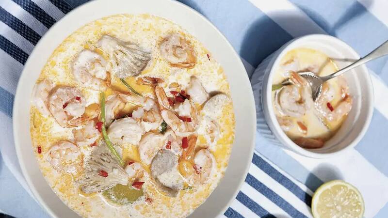 2. En otra olla grande calentar el aceite a fuego medio-bajo, agregar el ajo, tallos de cilantro, cáscaras de limón, ají y cocinar 10 minutos. Añadir el pimentón, cocinar 2 minutos más y eliminar el ajo. Verter el caldo de camarones reservado y llevar a ebullición. Sazonar con sal y pimienta. Incorporar la leche de coco y cocinar 3 minutos más. Agregar los champiñones, camarones pelados y cocinar hasta que estén cocidos. Verter el jugo de limón y revolver.