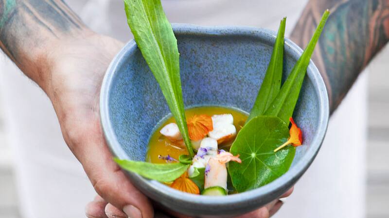 3. En pocillos individuales distribuir la salsa de naranja y encima disponer los camarones reservados. Servir decorado con las flores y hojas verdes.