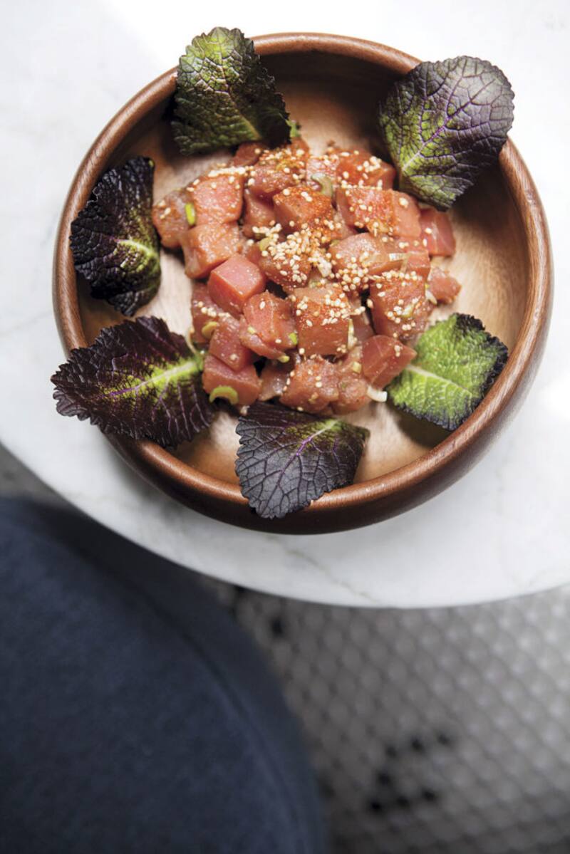 2. En platos individuales distribuir al centro el poké y decorar alrededor con las hojas verdes. Espolvorear encima sésamo y ají. Servir de inmediato.