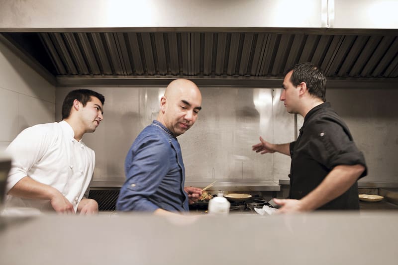 En la cocina del nuevo restorán: Andrés y José Ozaki junto a Cristián Zuloaga, sous-chef de Piso Uno.[/caption]