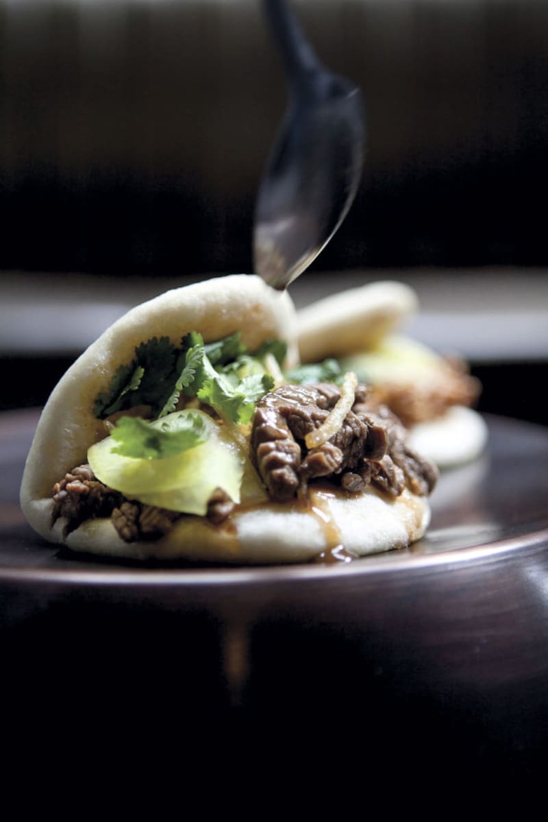4. En un wok con agua hirviendo colocar una vaporera forrada con papel mantequilla, encima colocar de a poco los baos, tapar y cocinar a fuego medio hasta que la masa esté cocida. Si fuera necesario, agregar más agua caliente al wok. Retirar los baos, eliminar el papel de entremedio y rellenar con la carne, papas fritas, nabo y cilantro. Repetir el mismo procedimiento con el resto de baos y rellenos. Servir de inmediato.
