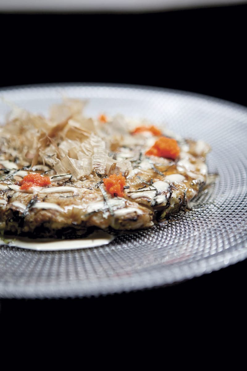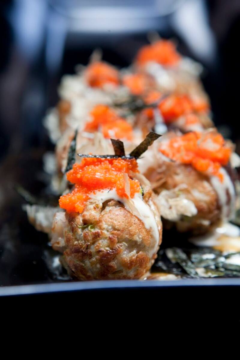 2. Calentar una plancha especial para hacer takoyaki (con formas de bolitas) a fuego alto, pincelar con aceite cada hueco. Cuando el aceite esté caliente, verter el batido reservado hasta la mitad de cada hueco, agregar en cada uno el repollo, jengibre, cebollín y 1 trozo de pulpo. Rellenar con más batido y dejar cocinar hasta dorar. Luego con un pincho dar la vuelta de cada bolita para cocinar por otro lado hasta dorar completamente. Servir de inmediato con salsa teriyaki y mayonesa, decorado con caviar y nori.