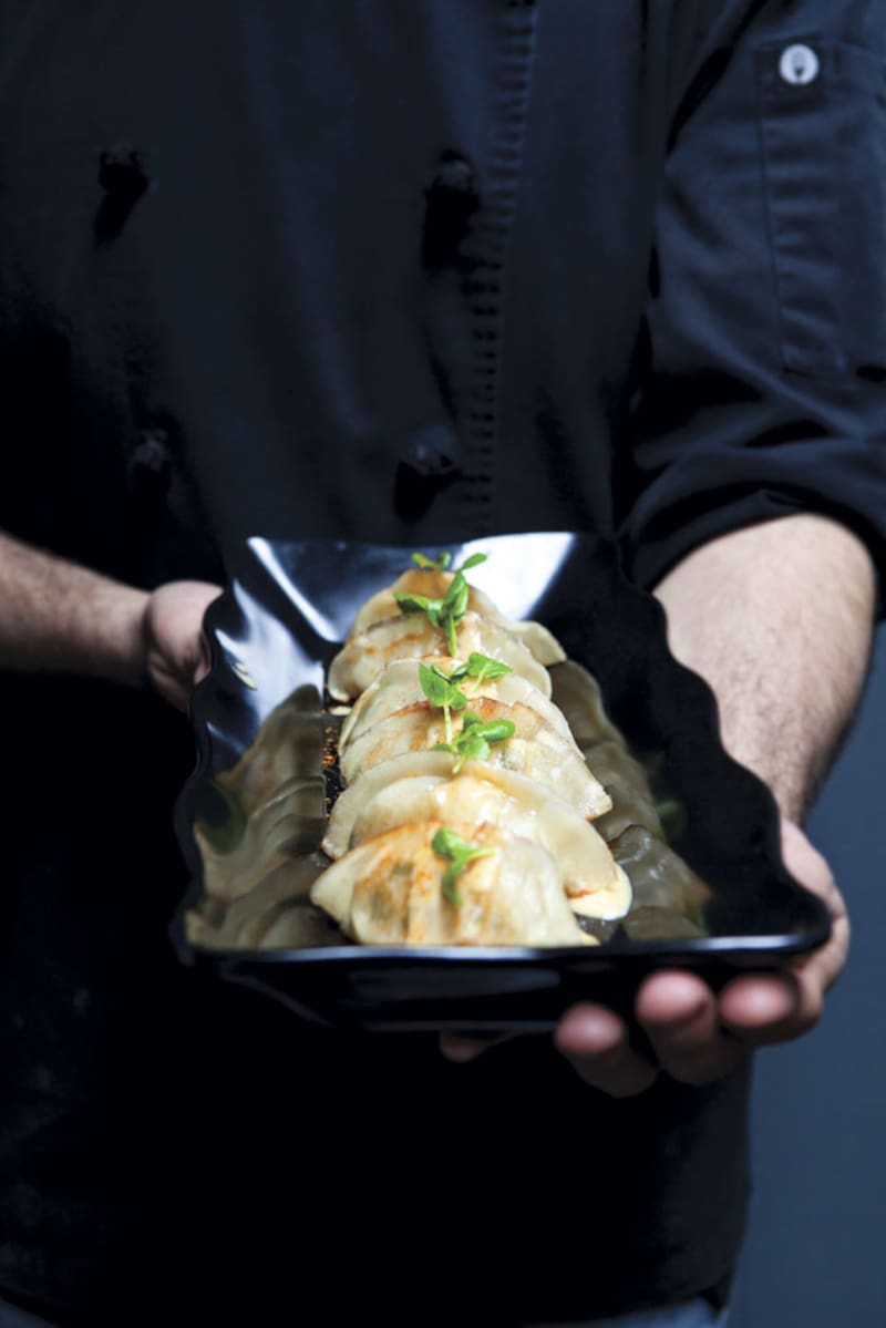 4. En una fuente extendida colocar las gyosas y decorar encima con la salsa de coral. Servir de inmediato.