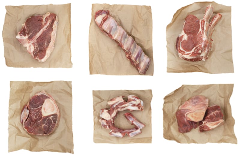 De izquierda superior a derecha inferior: Entrecot, asado de tira, costillar de vacuno, ossobuco, cola de buey y cazuela.