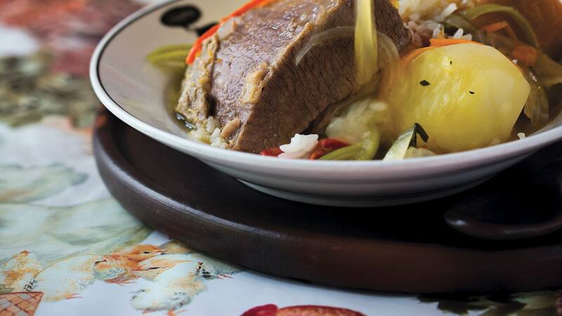 3. Sirve en un plato hondo de greda o librillo para que quepa cómodamente una papa, zapallo, choclo, presa de carne y las verduras. Agrega un cucharón de caldo y finaliza con un poco de cilantro picado y un ají verde.