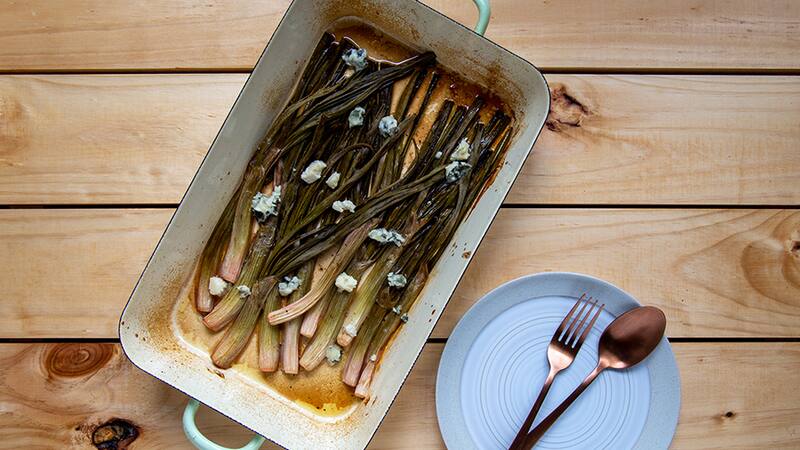 Cebollines asados con queso roquefort