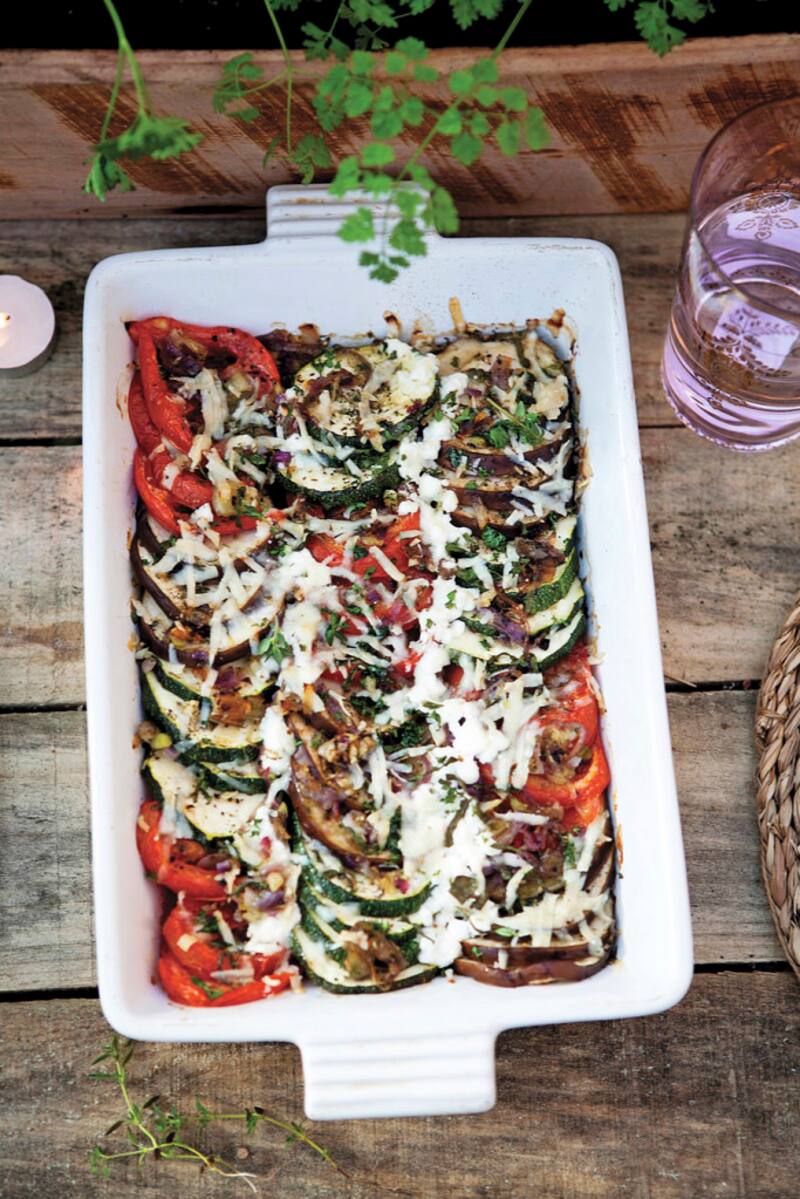 Tián de berenjena, zapallo italiano y tomates con ricota y hierbas (para 6-8 personas)