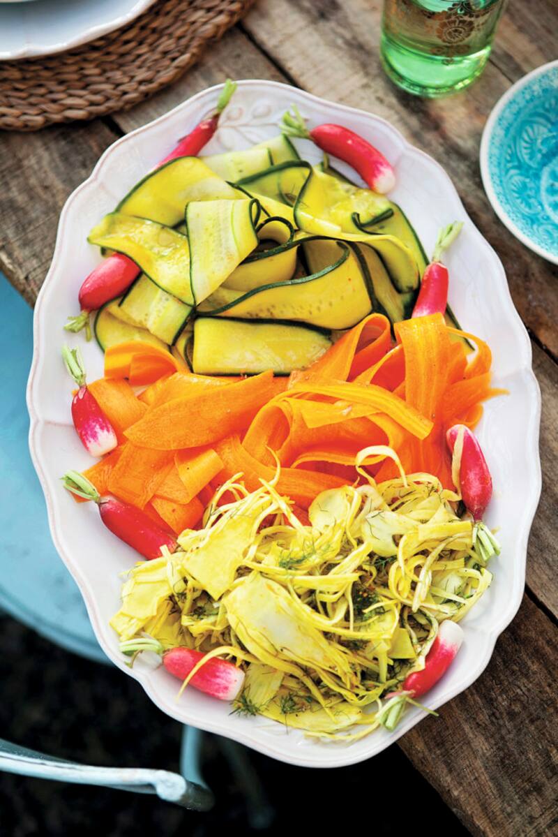 2. Mientras tanto, con una mandolina, cortar las verduras en cintas delgadas o en julianas muy finas (dejar los rabanitos enteros) y colocarlas en boles por separado. Distribuir el vinagre sobre las verduras, espolvorear la pimienta y dejar macerar mínimo 30 minutos hasta 24 horas.