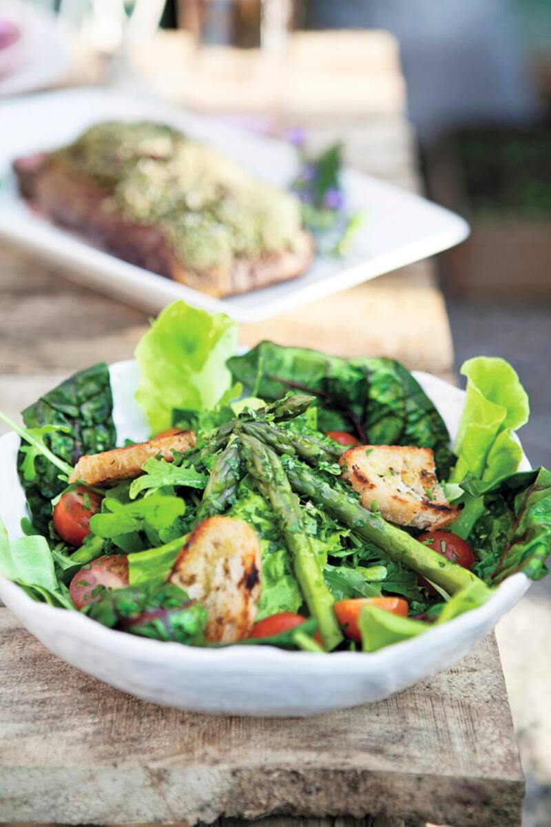 Ensalada con brotes y hierbas de verano, espárragos y crutones de ajo (para 6-8 personas)
