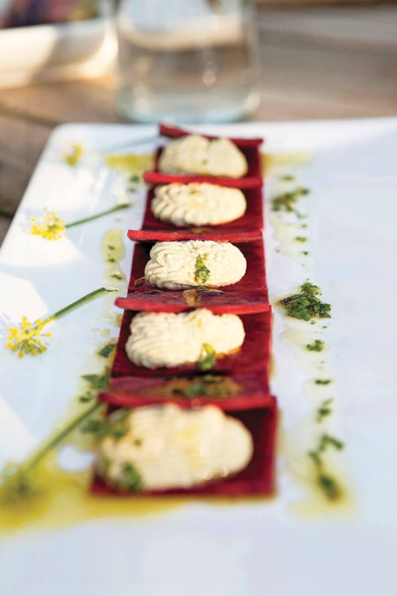 5. Al momento de servir, colocar 1 cucharada del hummus reservado entre los cuadrados de betarraga, como raviolis abiertos. En una fuente colocar los raviolis, rociar encima el aceite de hierbas reservado y decorar con hierbas o flores. Servir de inmediato con pan pita.