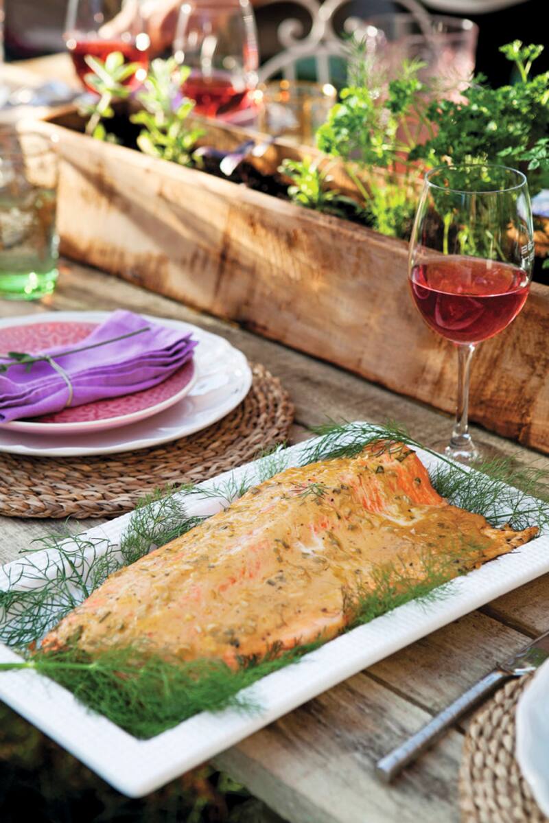 2. El día del evento. Precalentar el horno a temperatura alta. En una lata de horno colocar el salmón y cubrir la superficie con la mitad del adobo. Sazonar con sal y pimienta. Hornear 10-12 minutos o hasta que la carne esté rosada pero no seca. Retirar del horno y tapar el salmón con papel aluminio y dejar reposar, 30 minutos.