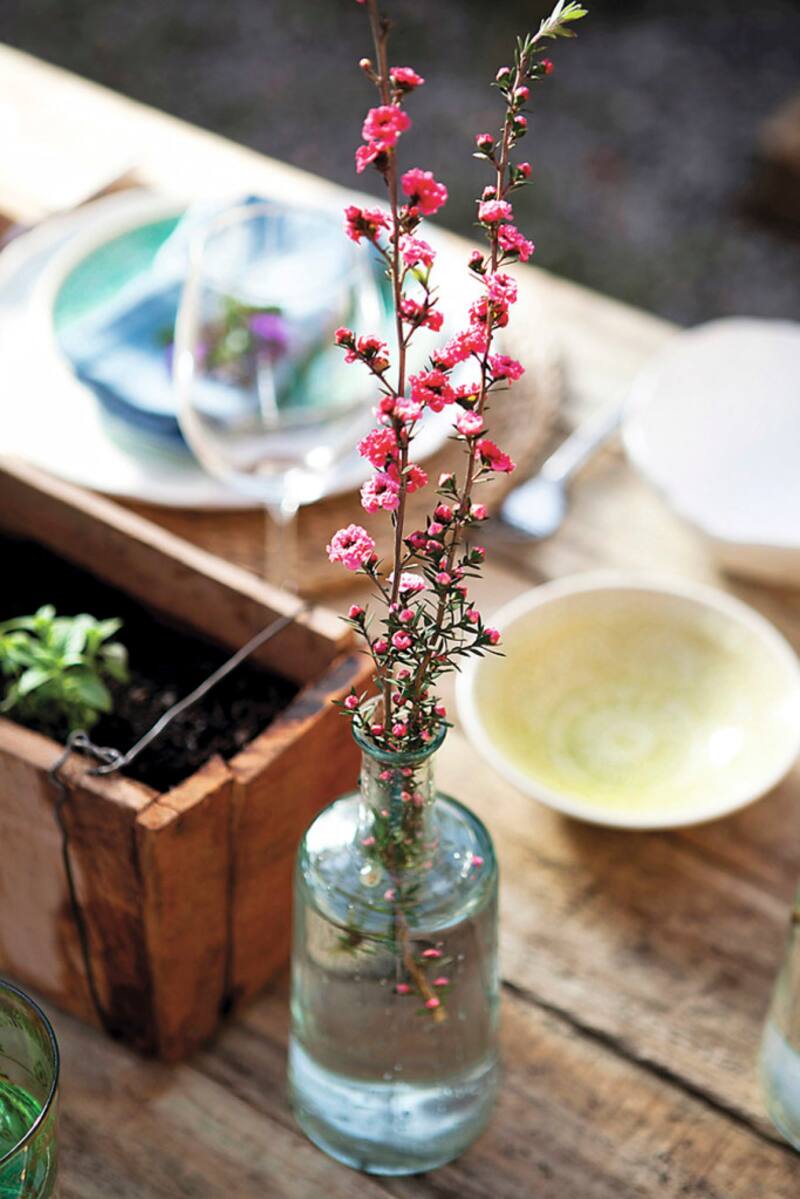La simpleza de los invernaderos permite que una decoración muy sencilla –como las ramas de un árbol en flor– baste para componer una mesa tan sabrosa como acogedora.