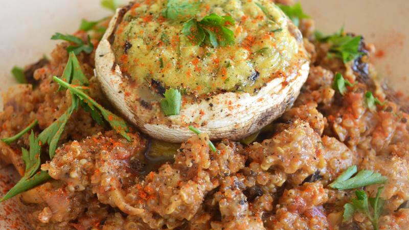 1. Precalentar el horno a 180C. En una olla, cocinar la quinoa lavada con 1 taza de agua hirviendo y sal. Ahuecar los champiñones, sin romperlos y reservar el interior para agregarlo al quinotto.