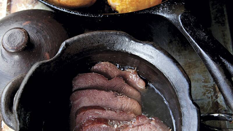 3. Cortar el chanchito en tajadas y rociar con el líquido de cocción. Servir acompañado de las frutas acarameladas calientes, espolvoreadas con unos granos de sal de mar. Servir de inmediato.