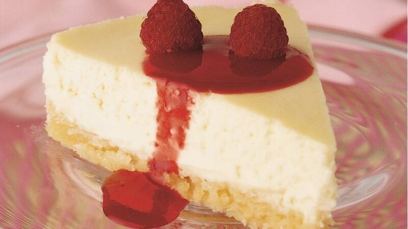 4. Preparar el relleno. En un bol colocar los quesos crema y batir hasta que estén suaves; agregar, sin dejar de batir, la leche condensada, huevos y jugo de limón hasta que la mezcla esté homogénea. Luego, verter en el molde reservado sobre la masa y hornear 20 minutos más o hasta cuajar. Retirar del horno, dejar enfriar y servir decorado con la salsa de frambuesa reservada.
