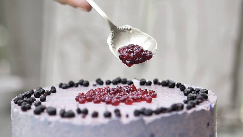 3. En otro bol remojar la gelatina con agua, calentar a baño maría hasta disolver e incorporar revolviendo a la mezcla anterior. Verter sobre el molde reservado. Tapar y refrigerar mínimo 3 horas. Al momento de servir decorar con el maqui y el caviar de maqui y cramberries.