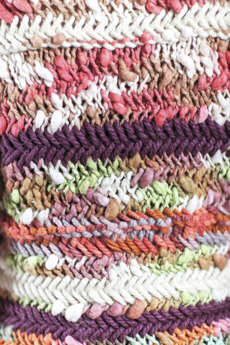 Puedes combinar aleatoriamente los colores que quieras o puedes conseguir un tono más parejo agregando un ovillo de lana de un color neutro o levemente matizado, como la lana Bulky de Revesderecho que tiene 3 hebras con lo que ayuda a emparejar el tejido. Encuéntrala en Revesderecho, Av Ricardo Lyon 222, Providencia.