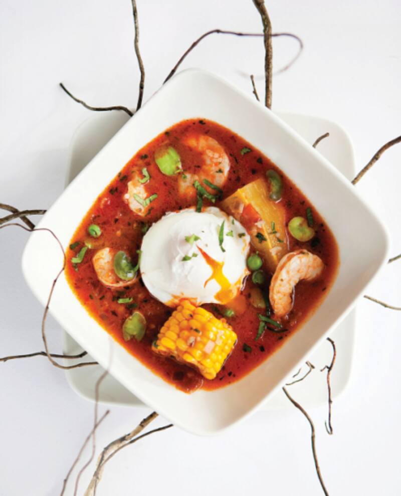 Chupe de camarones al estilo peruano con huevo pochado