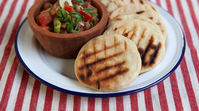 4. Estira la masa de las churrascas delgada y calienta una plancha o parrilla. Corta la masa con un cortador de la forma que quieras y luego coce sobre la plancha bien caliente, dorando por ambos lados. Saca y sirve tibias acompañadas del pebre.