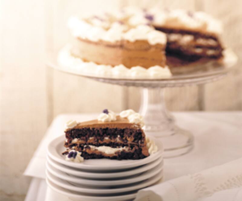 7. Cubrir la torta con el resto de la crema de chocolate y decorar a gusto. Refrigerar antes de servir. Esta torta se puede congelar rellena y decorada; se debe descongelar en el refrigerador por lo menos un día antes de servir.