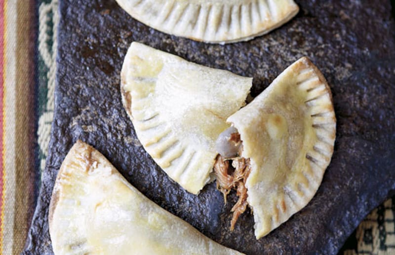 6. Sobre una superficie lisa extender la masa y formar círculos de 10 cm de diámetro. Colocar en cada círculo de masa 1 cucharada de relleno y 2 habas, doblar la masa en la mitad sobre el relleno y sellar presionando los bordes con un tenedor. Hornear las empanadas en un horno a temperatura media hasta dorar.