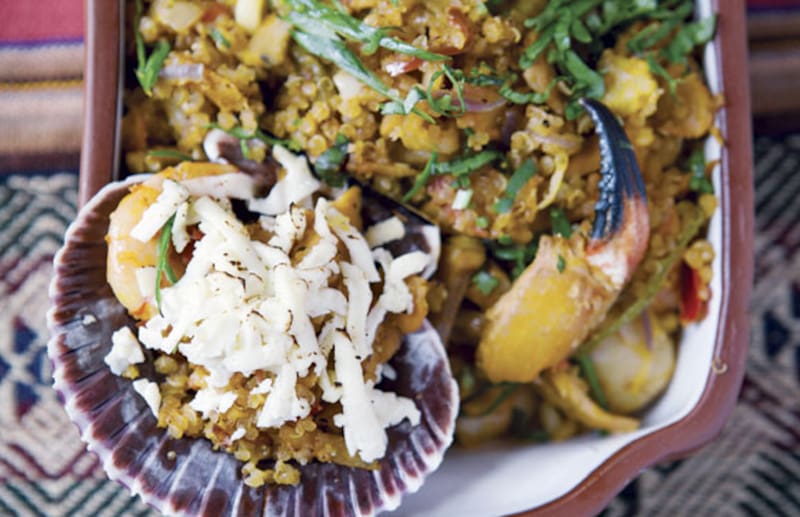 3. En una olla calentar 2 cucharadas de aceite a fuego medio, agregar la cebolla, páprika y pasta de rocoto, cocinar hasta que la cebolla esté transparente. Añadir el pimentón, cebolla morada, choclo y habas, cocinar 2 minutos. Agregar los mariscos, verter el vino y sazonar con sal y pimienta; seguir cocinando hasta que los camarones y ostiones estén cocidos. Finalmente agregar la quínoa reservada, la crema y mezclar. Servir de inmediato espolvoreado con cilantro.