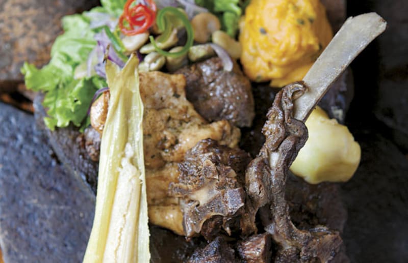 4. En platos o piedras individuales distribuir la carne de llama, carnes de pollo y vacuno reservada y el puré de camote reservado. Servir de inmediato acompañado de humitas, papas y ensalada.
