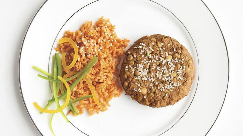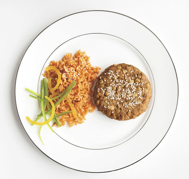 Hamburguesa de legumbres con risotto –libre de crema– de pimentón.[/caption]