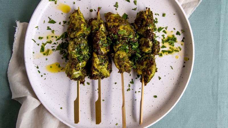 Cómo hacer brochetas de pollo y pesto de hierbas