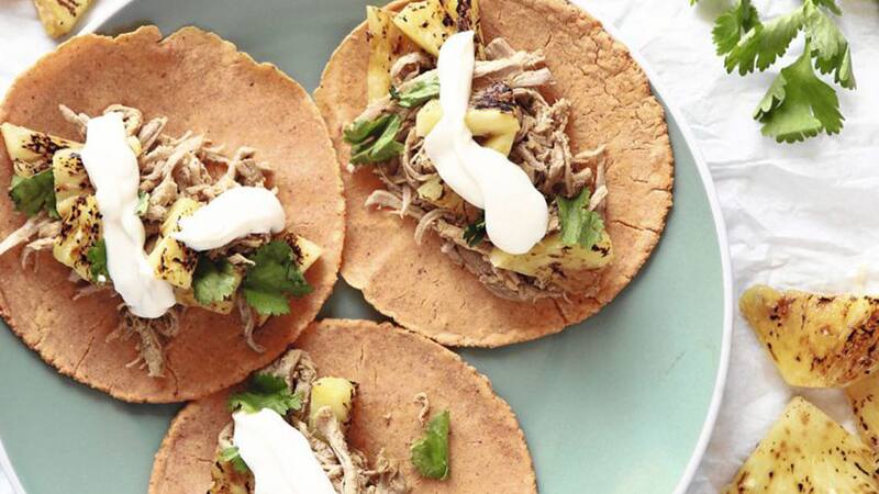 5. Poner sobre una tortilla un poco de la carne, la cebolla, las hojas de cilantro, la piña y la salsa de tomatillo. Terminar con la salsa de chipotle.