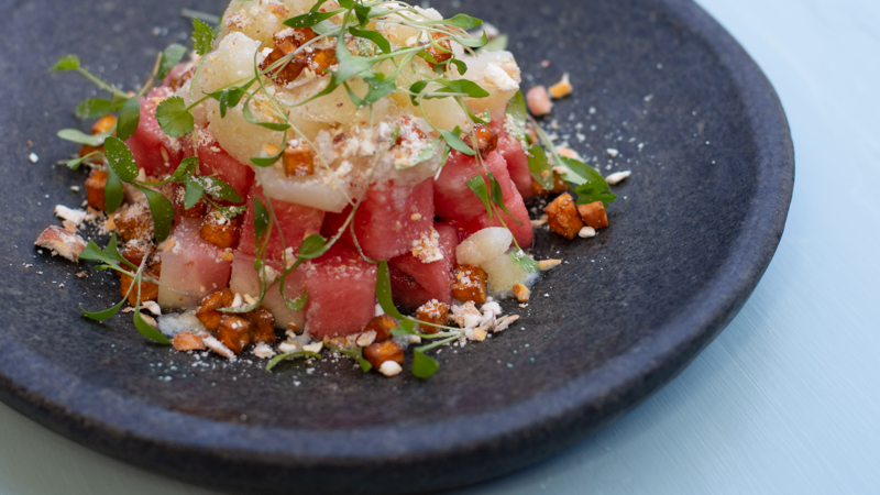 Esta receta viene a revolucionar el concepto de ceviche. La sandía viene a destronar a los clásicos marinos que vienen normalmente en esta preparación, y el pisco sour al infaltable limón, o a la leche de tigre. El chef Sebastián Jara (@seba_jara_) nos comparte su receta especial para un novedoso aperitivo frutal, entretenido y sorprendente para ocaciones especiales. Lo interesante también está en el uso que se le da al camote, planteándolo como una opción crocante para acompañar la suavidad de la sandía y el granito helado del sour. Si se quiere explorar, también se puede convertir en un postre, retirando los ingredientes salados y reemplazándolos por chocolate derretido, por ejemplo, o un acompañamiento de frutos rojos. Eso sí, tal como el clásico ceviche, no hay que prescindir del limón, venga como venga.