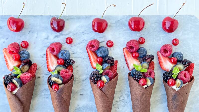 En la segunda semana de Verano Frutal, la chef Franziska Rösner nos trae esta receta de conitos de chocolate rellenos con cheescake de frutos rojos para disfrutar de un buen postre de verano. Esta receta es ideal para hacer con los niños, porque además de cocina, requiere de manualidades, usando por ejemplo, platos de cartón recortados para luego darle forma a los conitos. Además, la mezcla interior es muy fácil y rápida de hacer, igual que la decoración. Perfecto para pasar una tarde en la cocina con ellos, y luego servirlos al aire libre. Ojo, que las recetas de repostería y dulcería siempre requieren de mucha atención para que resulten, por lo que recomendamos seguirlas al pie de la letra.