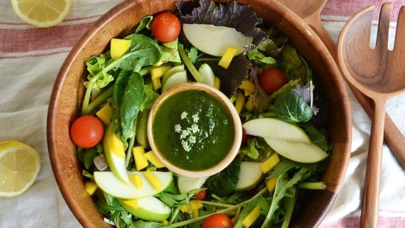 Cómo hacer ensalada con pesto de cilantro, manzana verde y mango