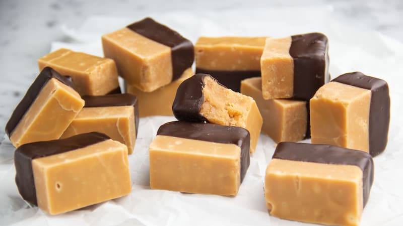 5. Picar y derretir a baño maría el chocolate. Retirar el papel aluminio, cortar el fudge en forma de cuadrados, sumergir la mitad del fudge en el chocolate, poner sobre papel mantequilla, dejar enfriar hasta que el chocolate endurezca.