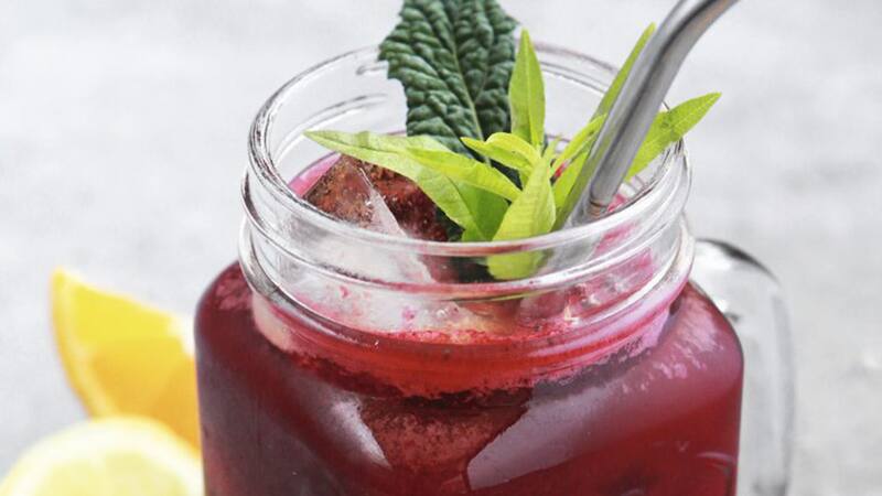 3. Licuar por una juguera de prensado en frío o de bajas revoluciones y mezclar con el jugo exprimido de naranja y limón. Servir de inmediato.