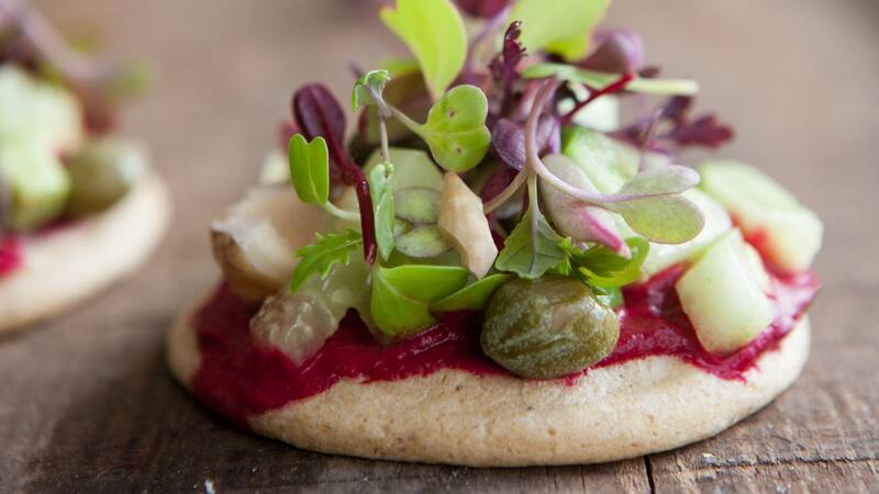 Cómo hacer mini panqueques con salsa de betarraga y ensaladita fresca