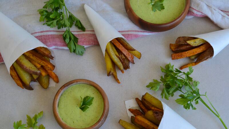 Cómo hacer papas y camote al horno con dip de perejil y pepinillos
