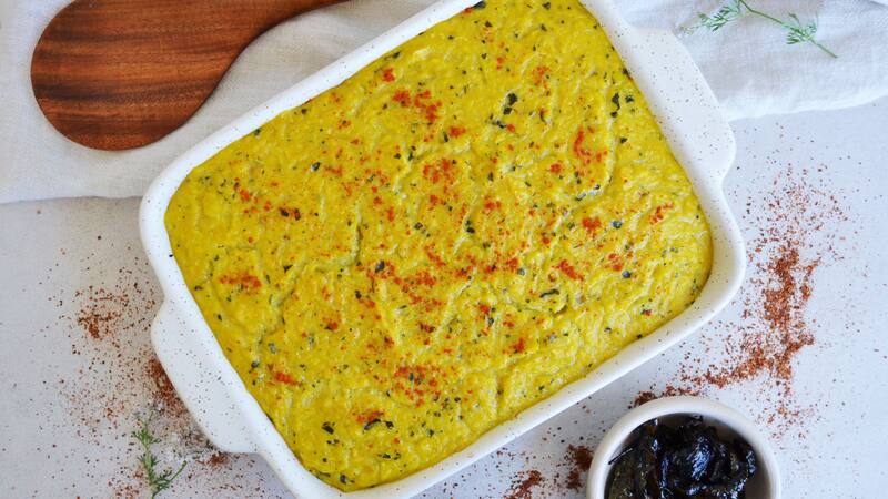 Una receta dulce y salada del clásico pastel de choclo, y en versión vegetariana. Esta vez el pino es de quinoa, berenjenas y cebollín, y el agridulce suave que le da el choclo queda perfecto junto con los pimientos acaramelados que realzan todos los sabores. La chef Fernanda Giacaman (@unacocina_feliz) recomienda agregar las verduras que se tengan disponibles para el pino. Se pueden incluir aceitunas y pasas a gusto.