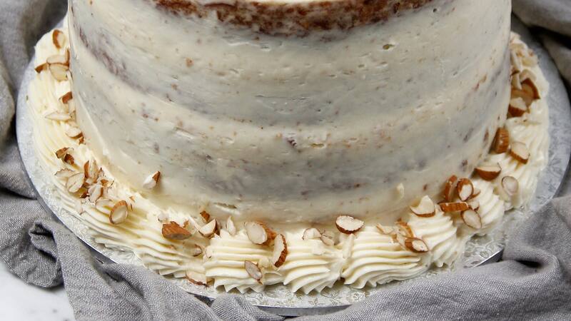 5. Para el montaje, disponer uno de los queques sobre un plato y cubrir con el relleno, emparejar y poner otro queque, repetir este paso hasta terminar. Cubrir los laterales y la superficie con la crema, decorar con almendras y servir.