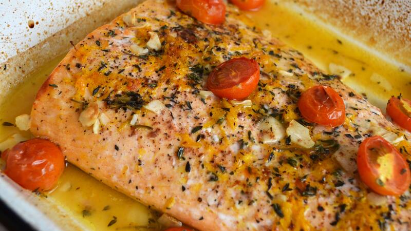 3. En una fuente para horno, poner el filete de salmón, agregar el vino blanco, el jugo de naranja y el aceite de oliva sobre toda la superficie. Incorporar la ralladura de naranja, el ajo picado, la pimienta, la sal, el tomillo y la nuez moscada sobre toda la superficie del salmón. Agregar el tomate cherry en mitades repartido en la bandeja y sobre el pescado. Llevar al horno por aproximadamente 15-20 minutos.