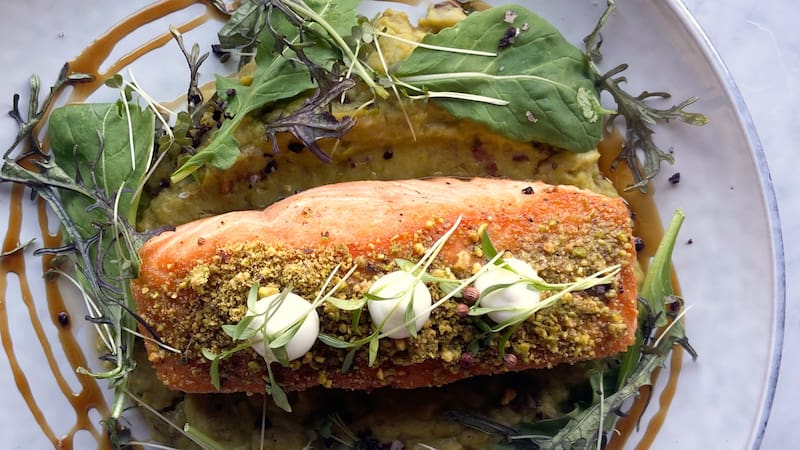 5. Retirar el salmón y emplatar con el puré como base y luego el salmón encostrado. Se puede decorar con limón o pistachos enteros.