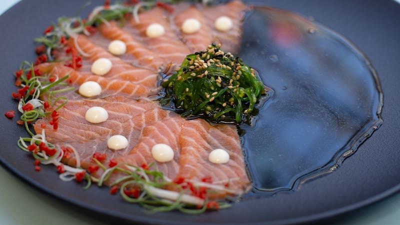 La salsa ponzu es un básico de la cocina japonesa, y su receta original lleva yuzu, un cítrico oriental. Por eso, el chef Sebastián Jara @seba_jara_) nos comparte su versión con naranja, que crea un exquisito sabor cítrico para el salmón. Además, le agrega una emulsión de mayonesa con concentrado de yuzu, que se puede encontrar en las tiendas de comida china. Si no, se puede hacer perfectamente con limón o limón de pica. Lo importante, es que la salsa quede homogénea, y luego al servir, se puede jugar con la decoración.