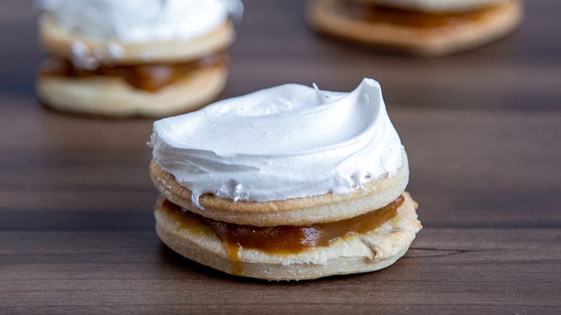 6. Preparar el merengue, poner las claras y azúcar en un bol y llevar a baño maría batiendo -idealmente con batidora eléctrica- por 7 minutos, hasta que se forme un merengue bien duro, sacar del fuego, batir 1 minuto más para enfriar y luego bañar las tablillas ya rellenas. Dejar secar.