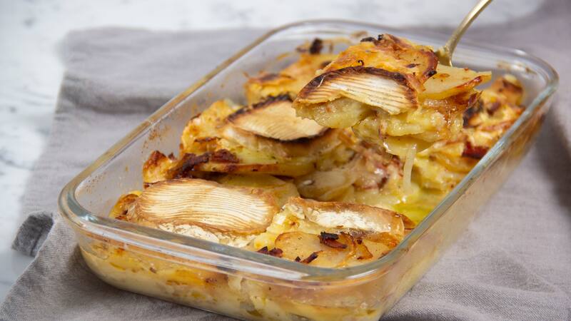 Esta tartiflette de papa es perfecto para un acompañamiento de plato principal rápido y contundente. Se hace con queso camembert, pero también puede haber una versión con queso azul.