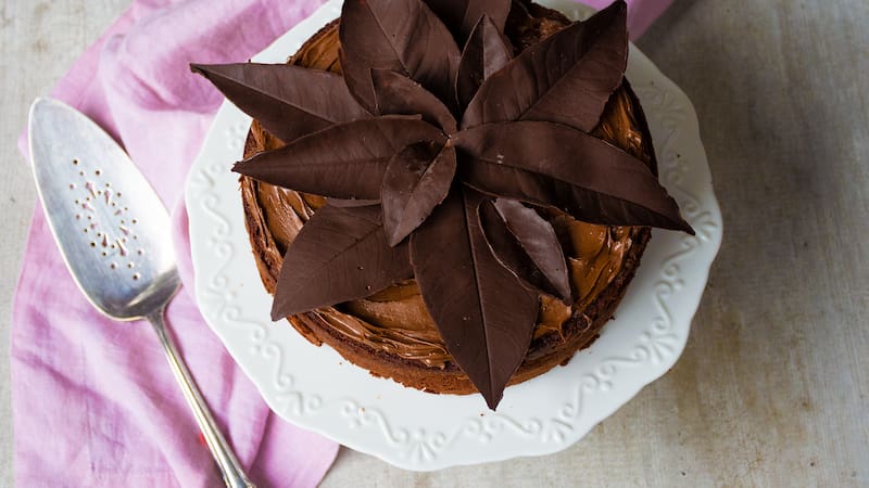 La cobertura de chocolate se puede hacer a baño María o al microondas. Para las hojas de chocolate, es importante que éstas sean lisas y sin pelitos, porque sino quedarán marcados. Luego al retirar la hoja, hacerlo con mucho cuidado deslizándola hacia abajo.