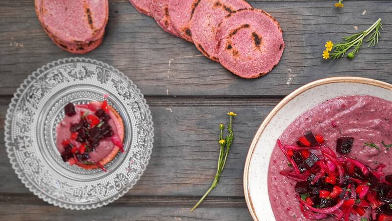 5. Servir con acompañamiento, como el humus morado de porotos negros.