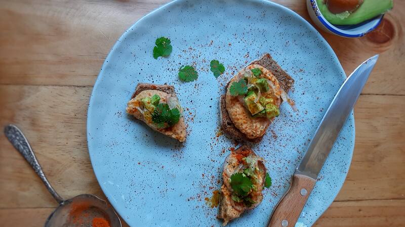3. Cortar el pan delgado, tostarlo y servir generosamente el humus sobre éste. Luego poner el pebre de palta, y finalizar espolvorear paprika por encima y hojas de cilantro.